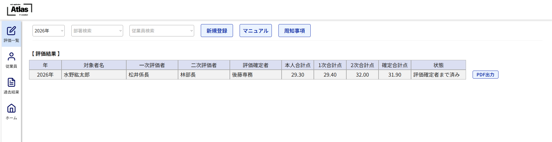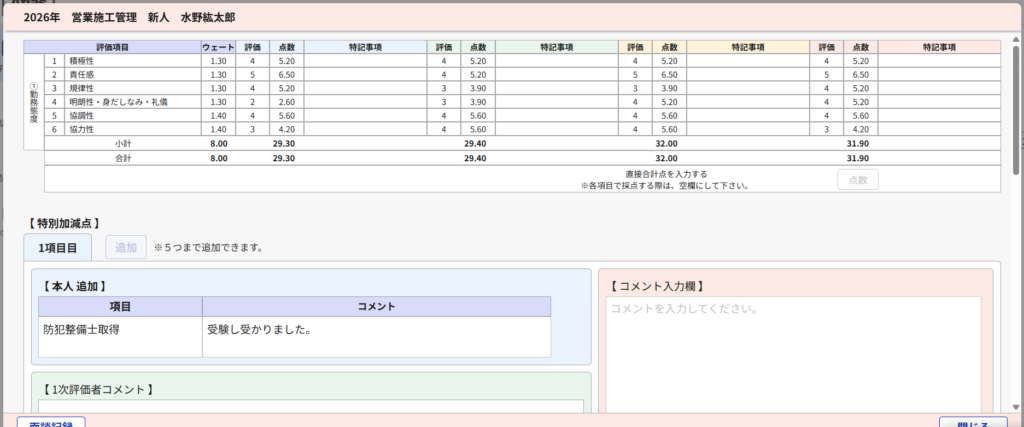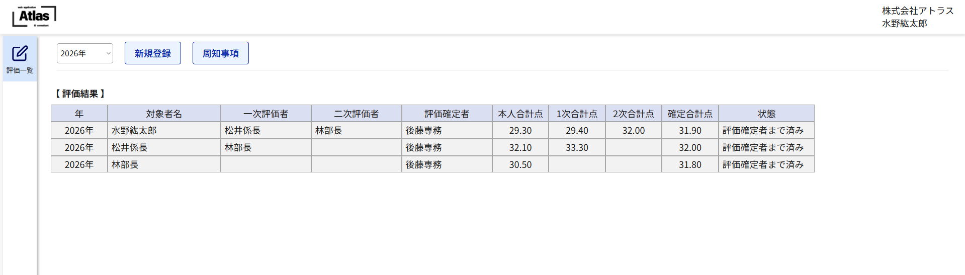 ・各従業員の評価状況が一覧で確認できます。