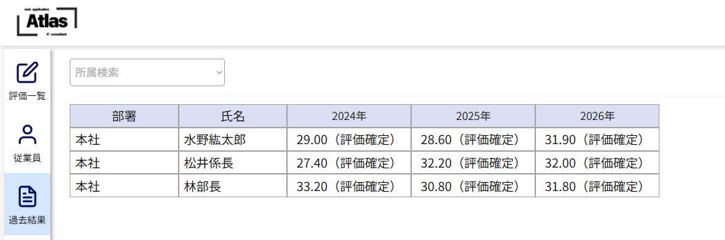 ・自分や担当している従業員の過去結果を閲覧することができる。